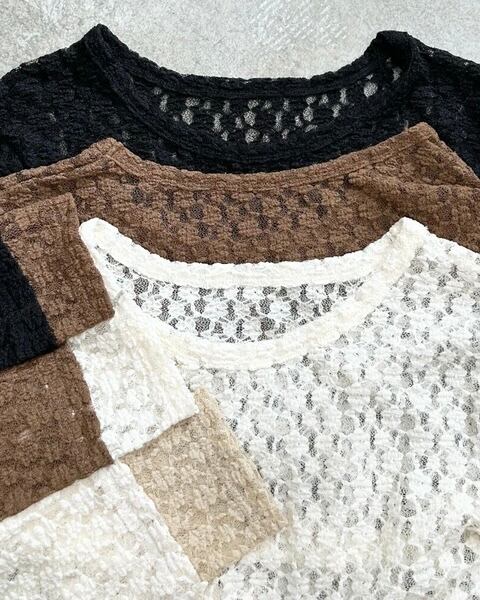 繊細なカットレース素材に、袖口の配色レイヤード風デザインを施した一枚で映える主役トップス。