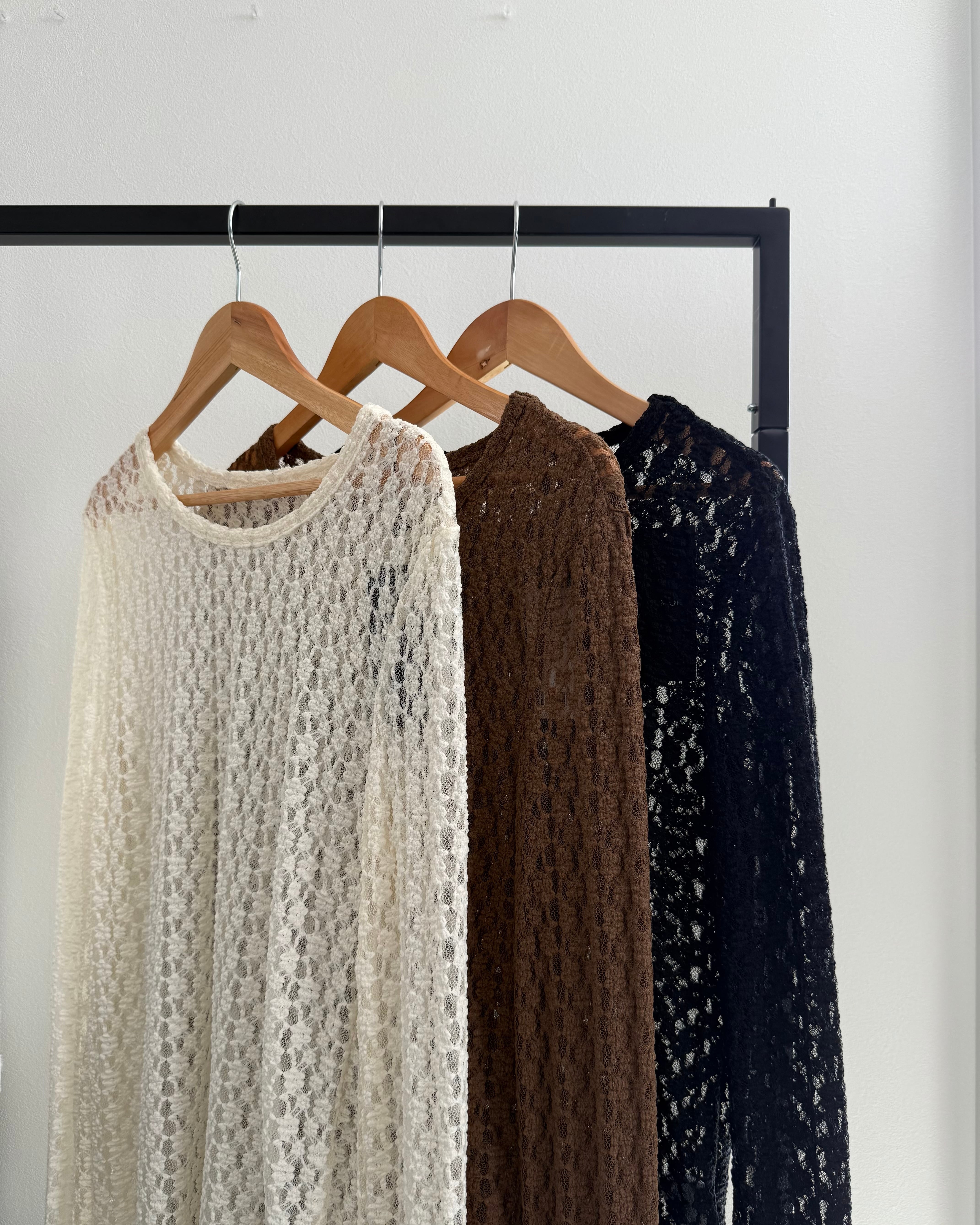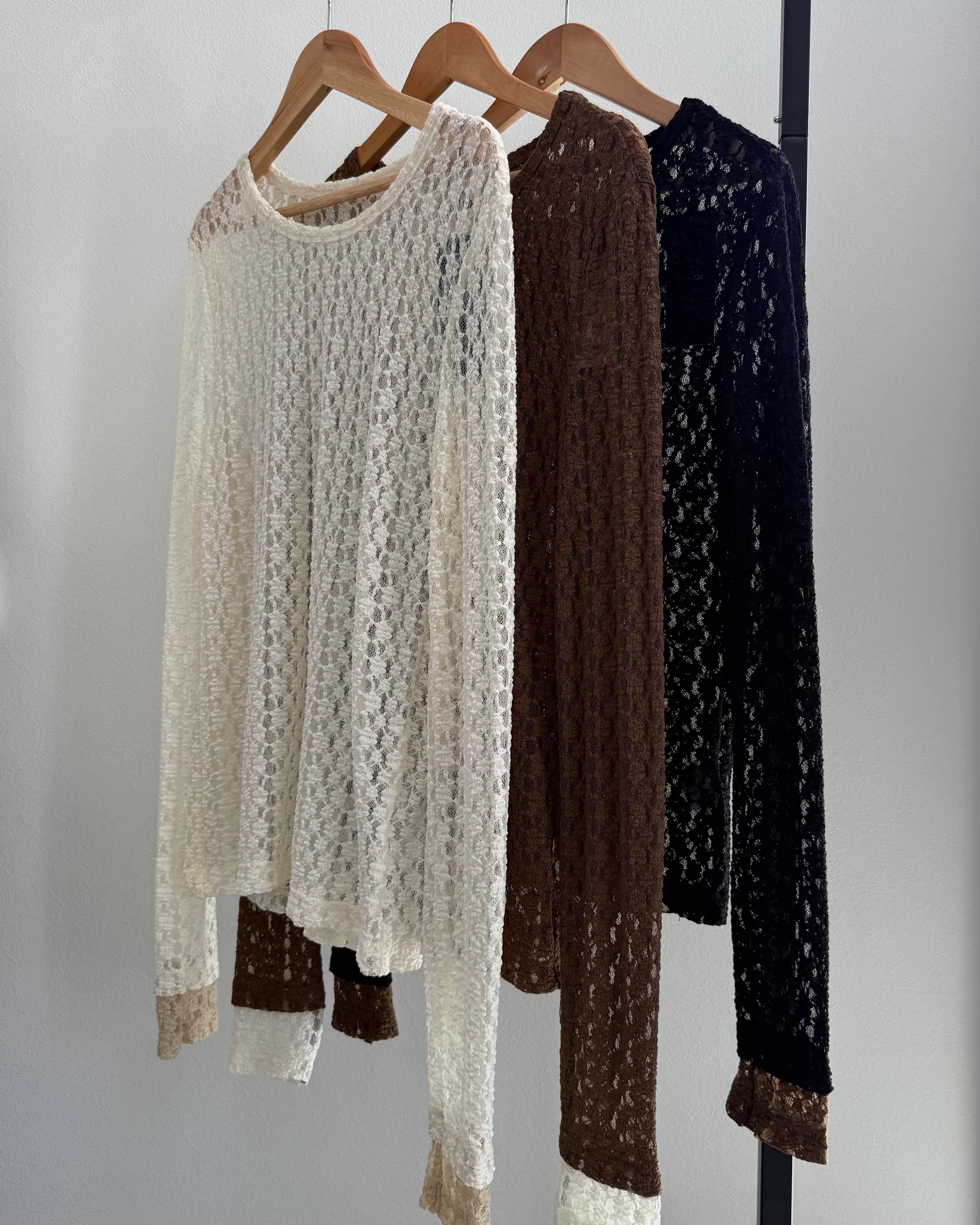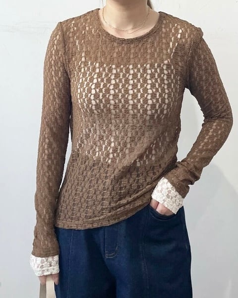 透け感のあるレースが軽やかさを演出しつつ、袖先の配色切り替えがコーデのアクセントに。