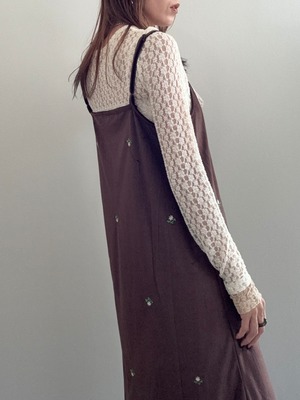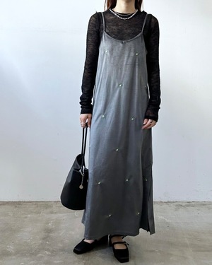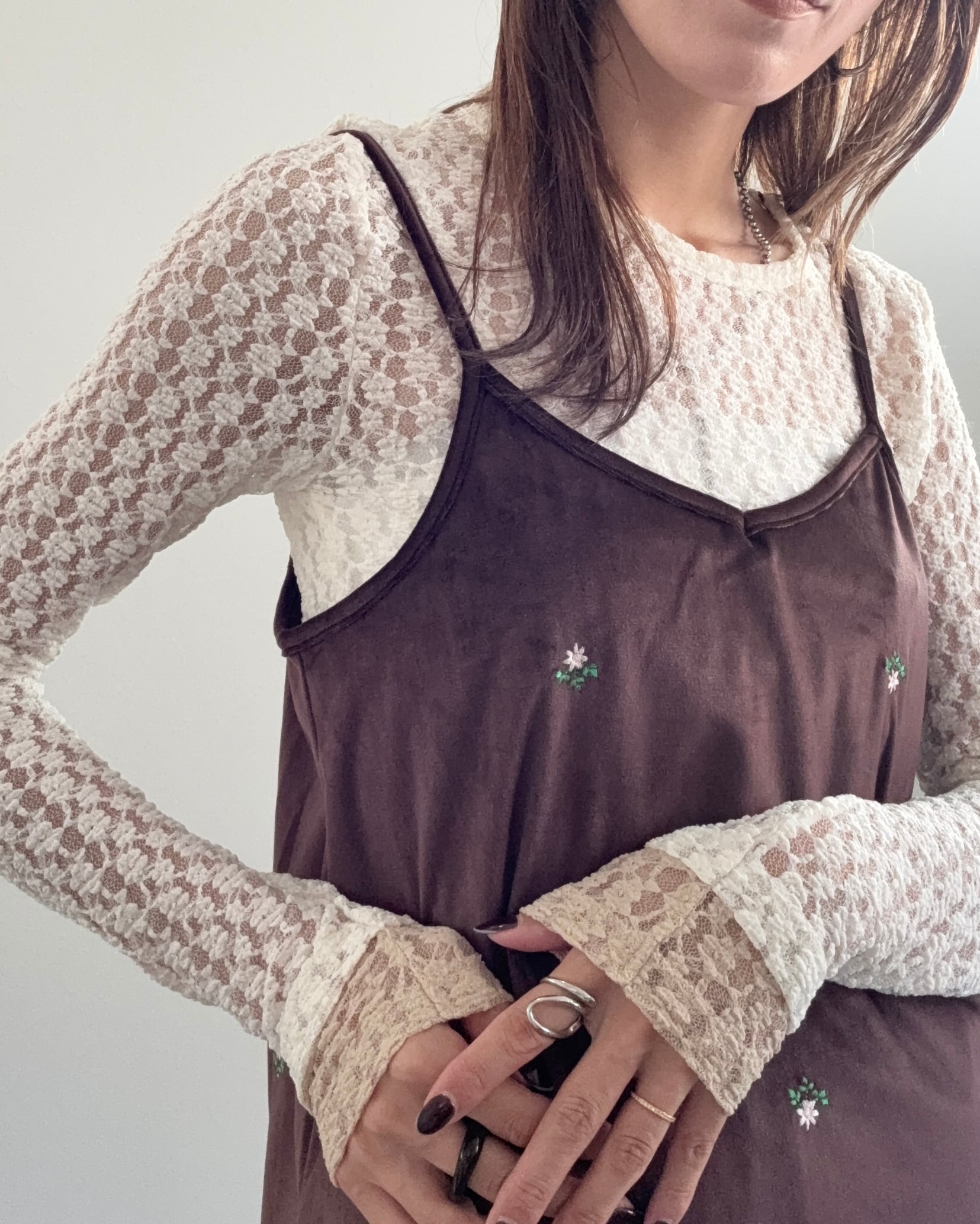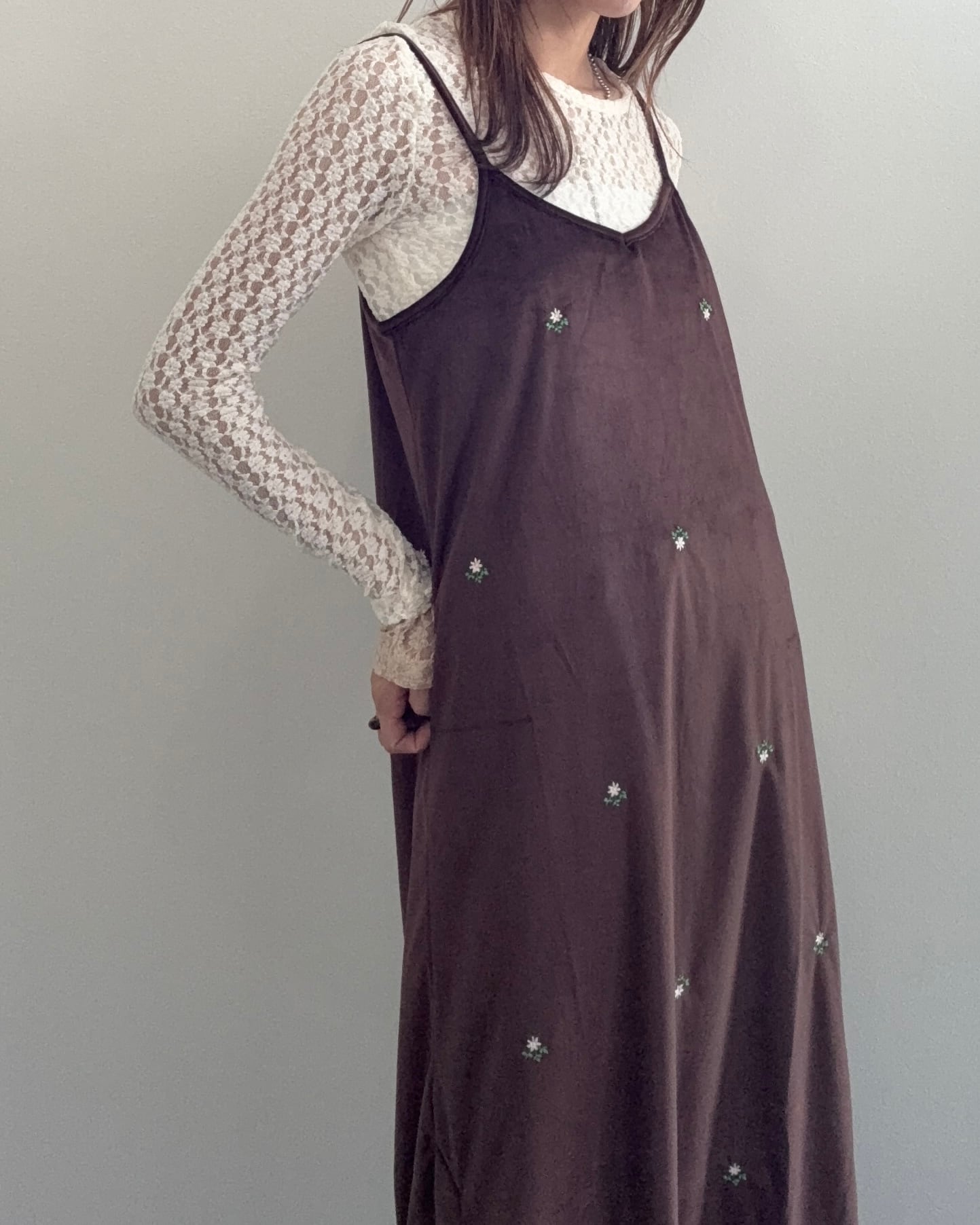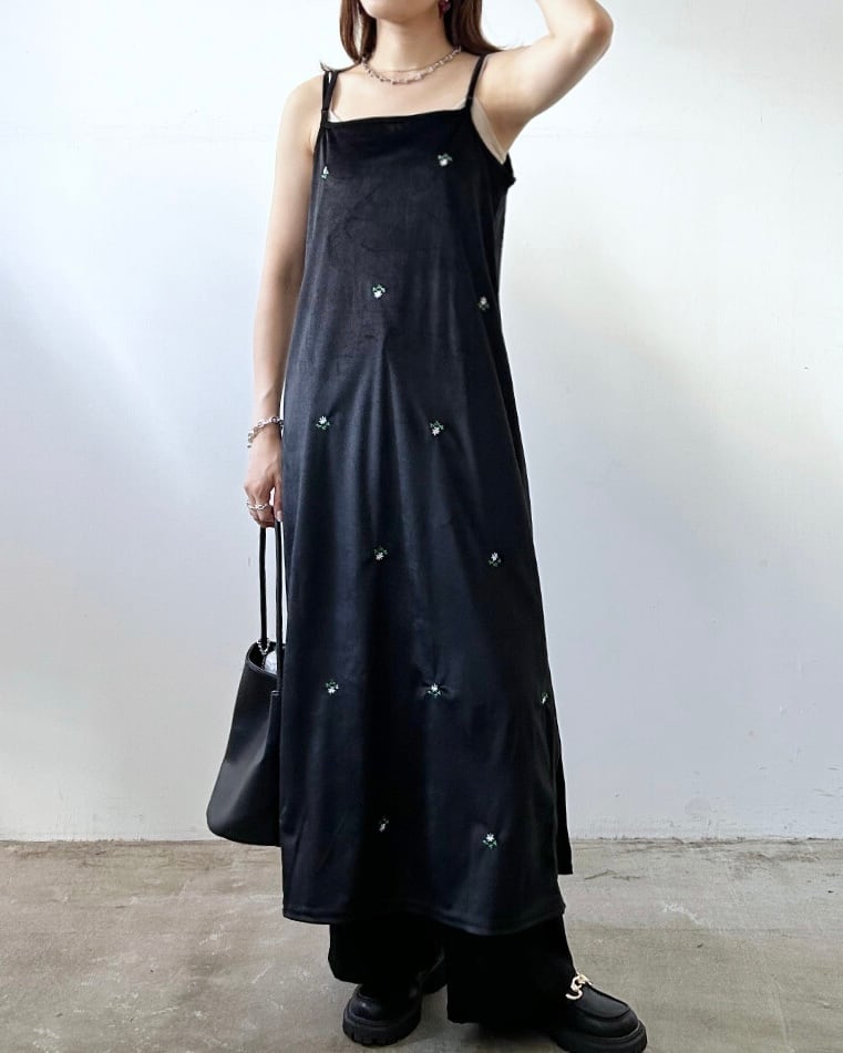 柔らかな光沢感と滑らかな肌触りが魅力のベロア素材に、小花刺繍を散りばめたキャミソールワンピース。