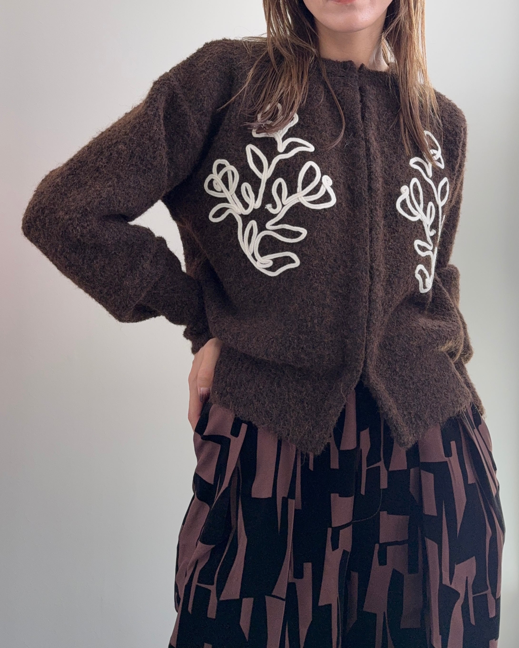 ・大胆なリーフモチーフが目を惹く、テープ刺繍が印象的なショート丈カーディガン。