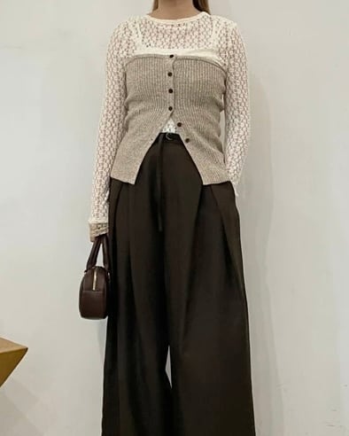 同素材トップスと合わせれば、セットアップ風の着こなしもおすすめ。