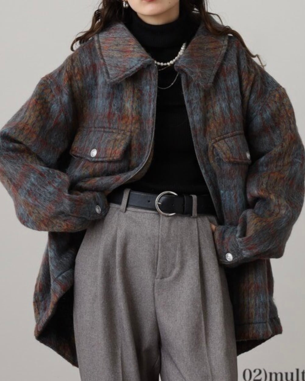 起毛チェックとコーデュロイの異素材使いが季節感を演出。