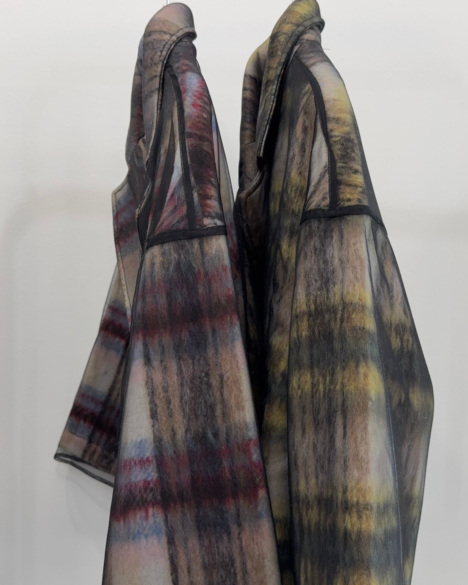 起毛感のあるシャギーチェック生地に、チュール素材を重ねたレイヤード仕様。