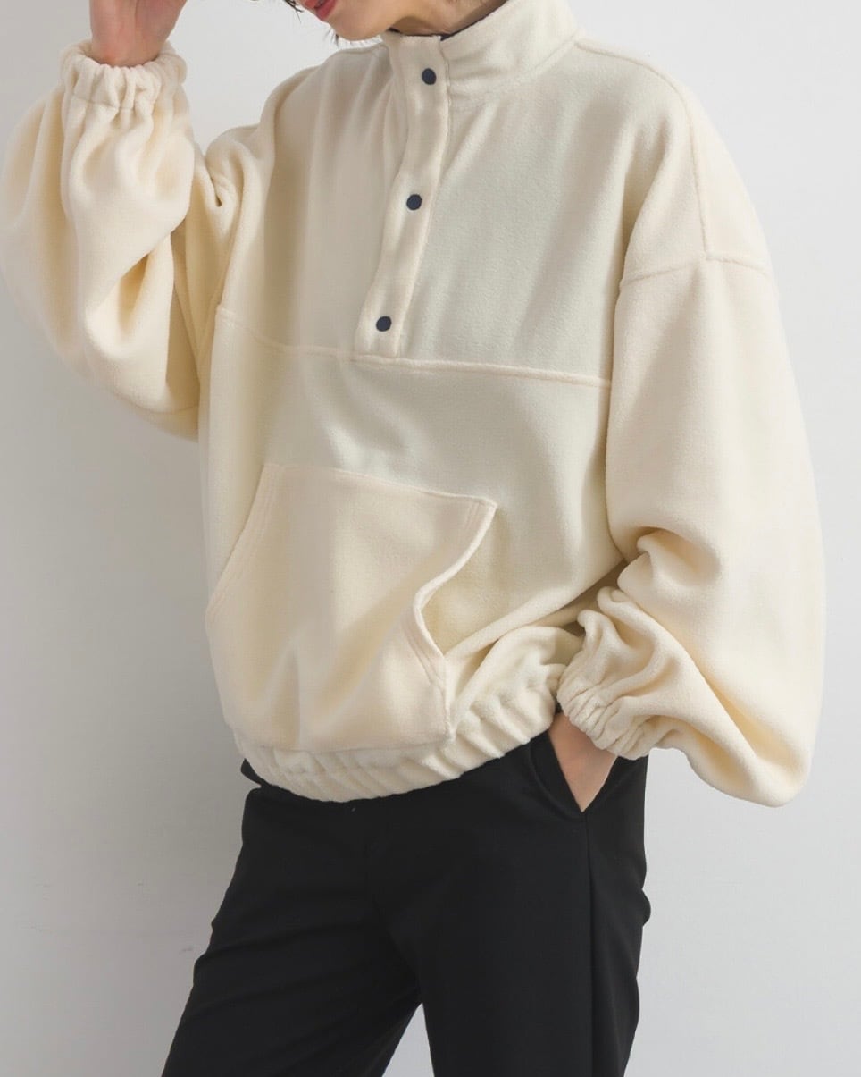 首元に自然な立体感を持たせつつ、ボタンの開閉で雰囲気を変えられる一着。