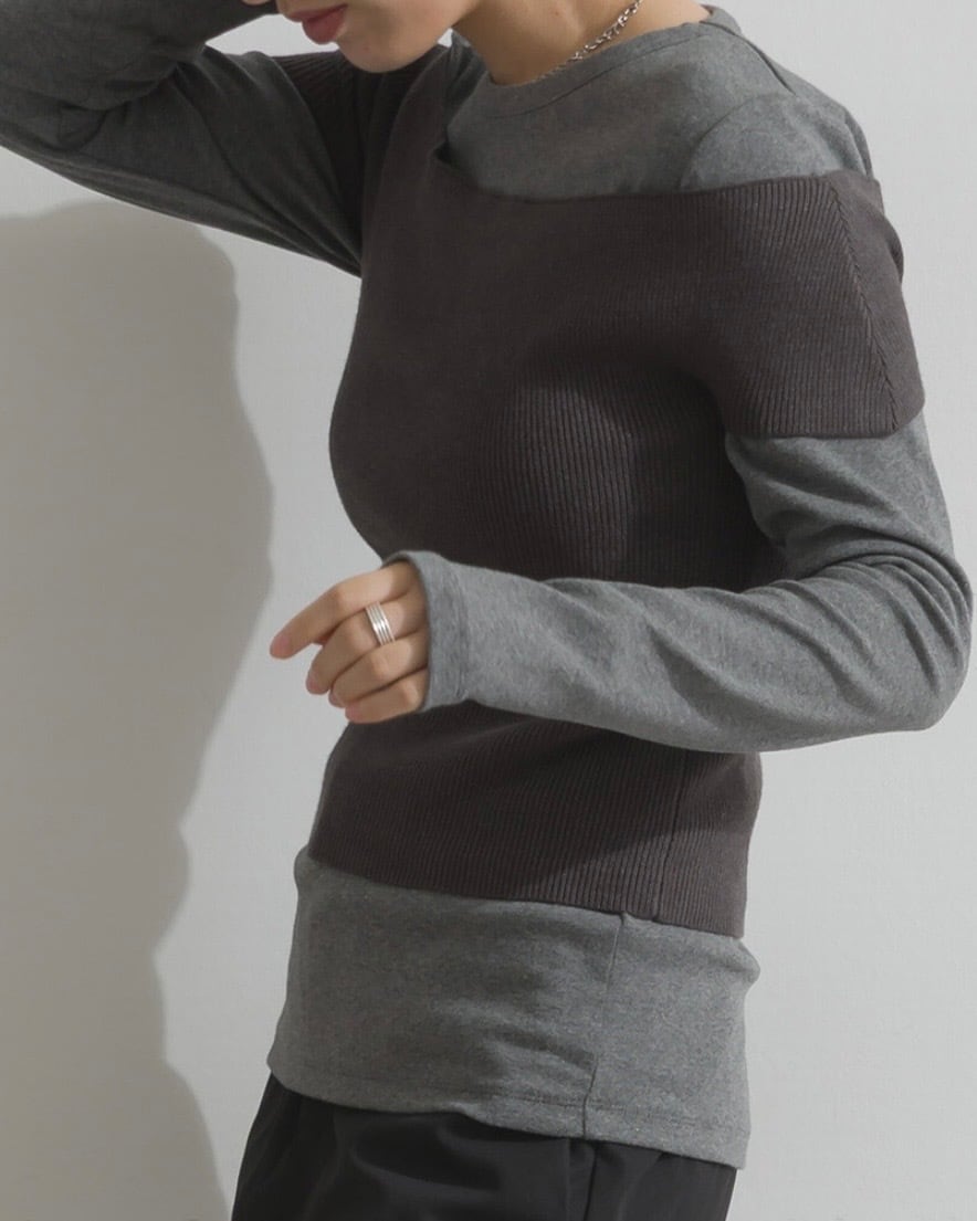 着こなしに奥行きを与えるレイヤード風トップス。