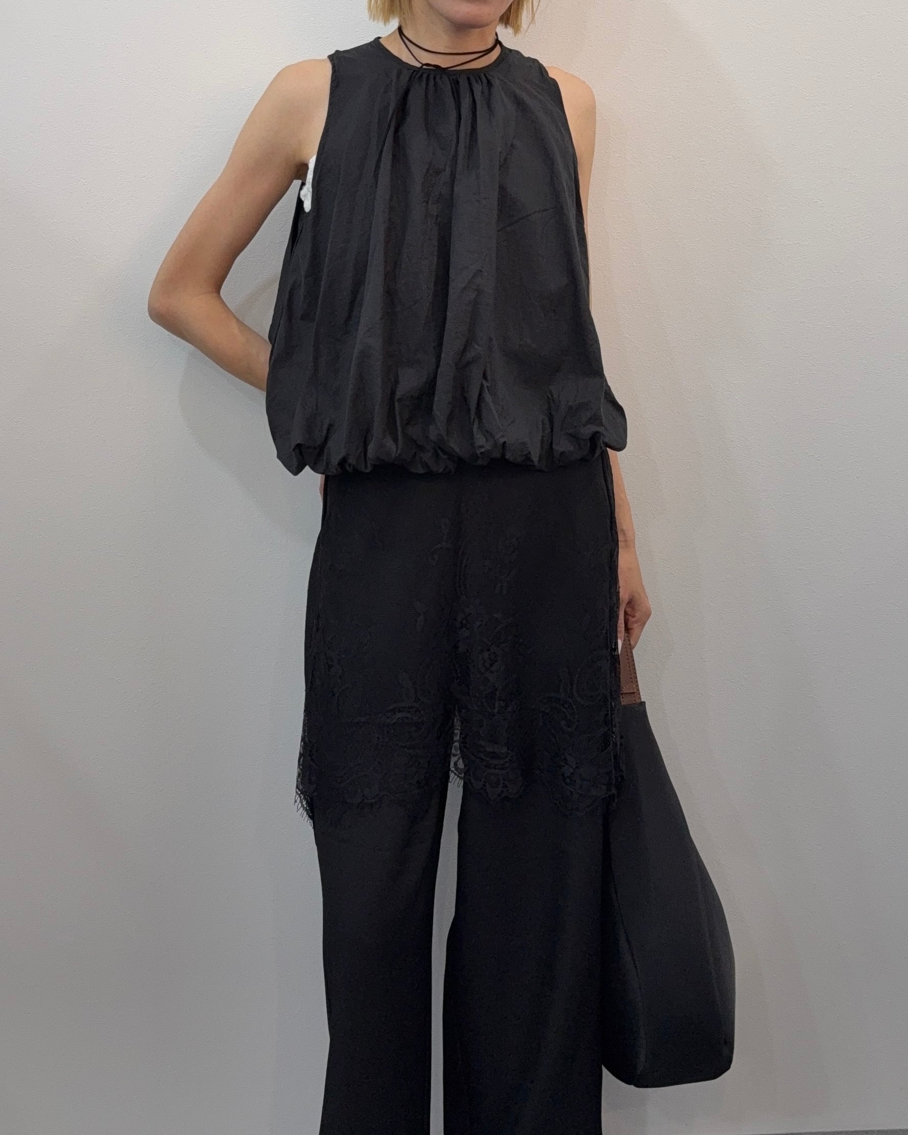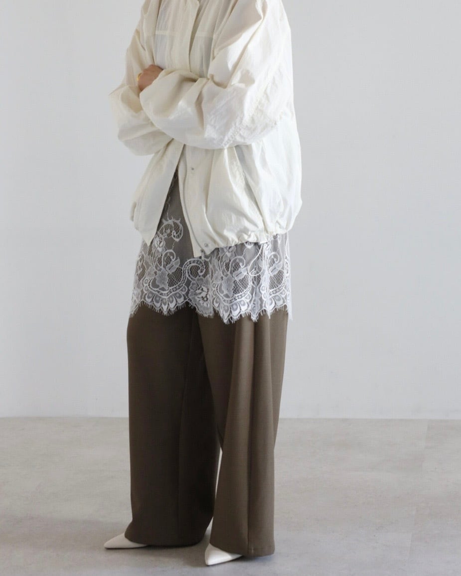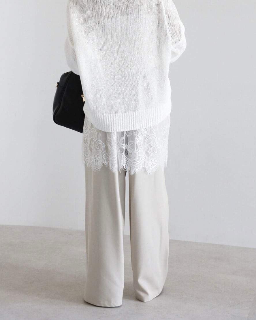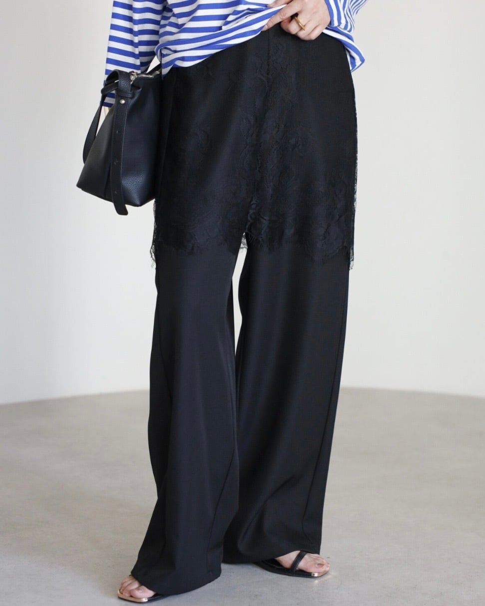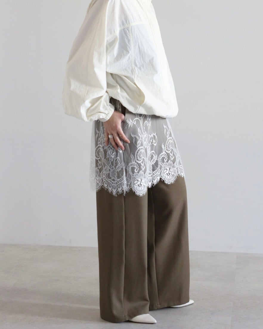 繊細なフラワーレースを重ねた、レイヤード風デザインが印象的なワイドパンツ。
