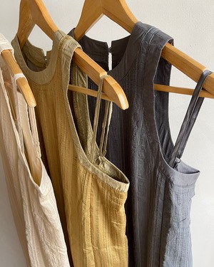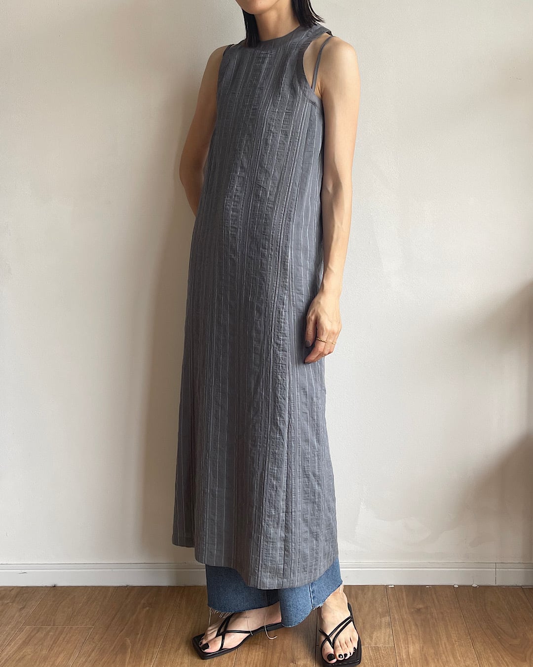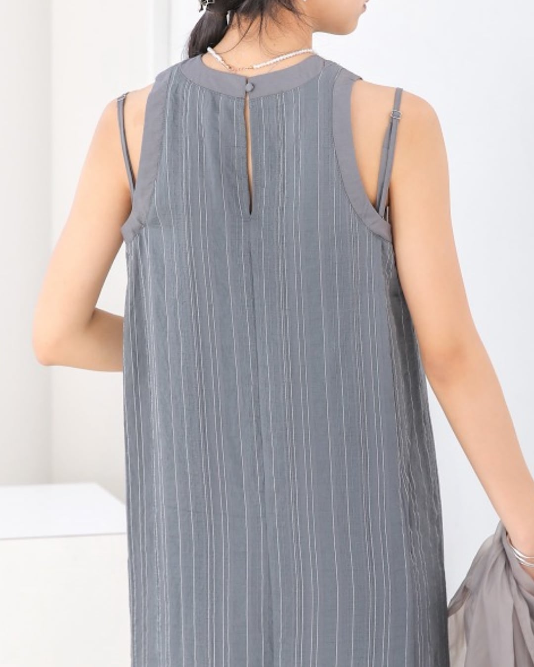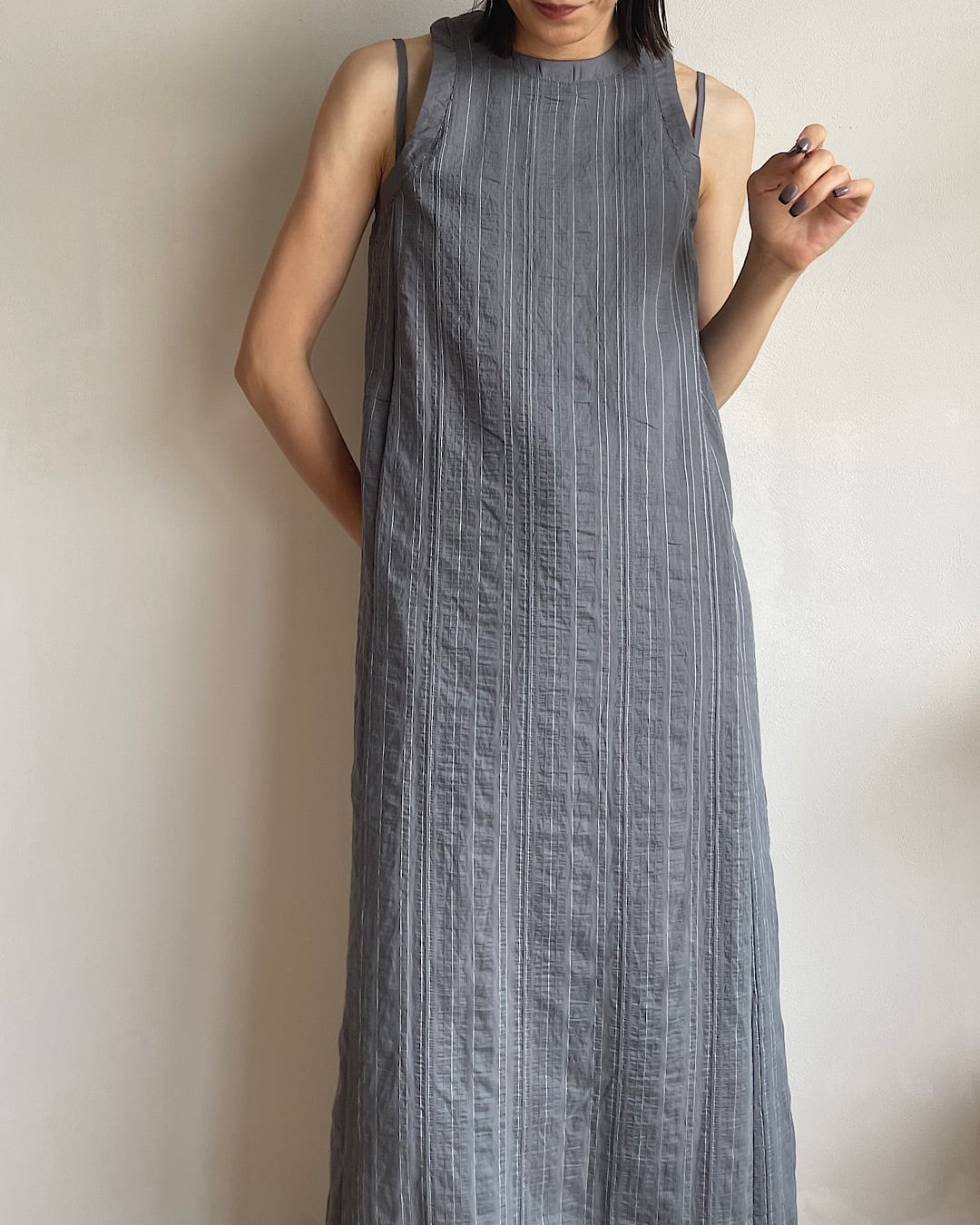 少しシワ加工されたような素材感と細いラインのストライプが夏らしく、